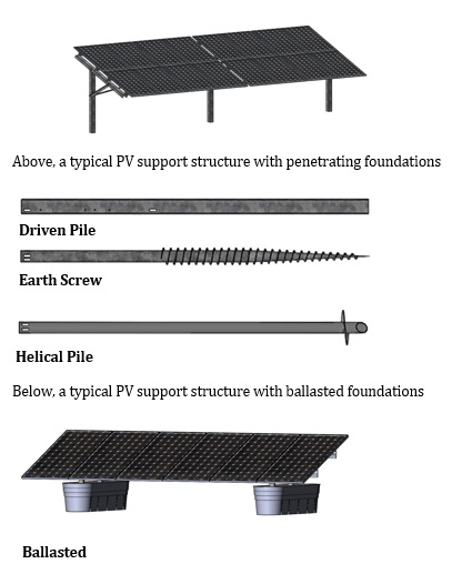 There are four principal types of foundations commonly utilized. Driven piles, helical piles, earth-screws, and ballasted foundations, as seen in the illustrations below.