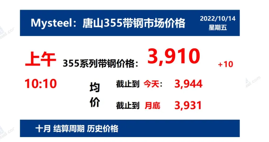 2022年10月14日,上午10:10, 唐山355系列带钢市场价格 3910元/吨,较昨涨10元/吨;本月结算周期,截止到今天均价:3944元/吨,截止到月底:3931元/吨。