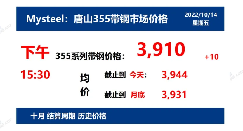 2022年10月14日,下午15:30, 唐山355系列带钢市场价格 3910元/吨,较昨涨10元/吨;本月结算周期,截止到今天均价:3944元/吨,截止到月底:3931元/吨。
