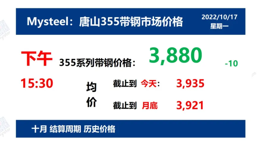 2022年10月17日,下午15:30, 唐山355系列带钢市场价格 3880元/吨,较昨降10元/吨;本月结算周期,截止到今天均价:3935元/吨,截止到月底:3921元/吨。