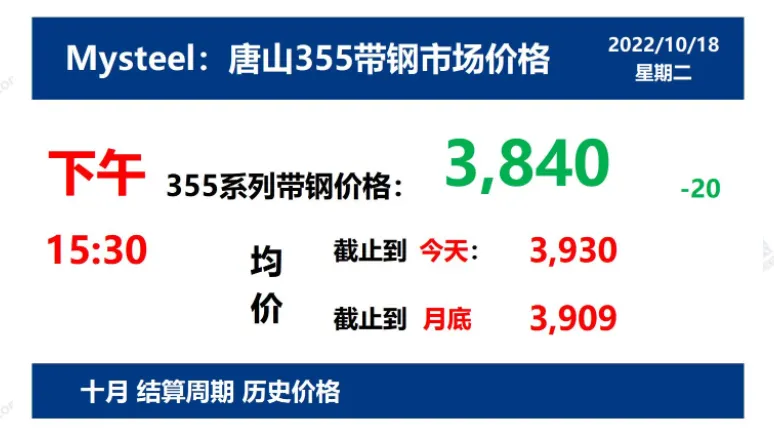 2022年10月18日,下午15:30, 唐山355系列带钢市场价格 3840元/吨,较昨降20元/吨;本月结算周期,截止到今天均价:3930元/吨,截止到月底:3909元/吨。