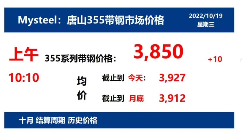 2022年10月19日,上午10:10,唐山355系列带钢市场价格 3850元/吨,较昨涨10元/吨;本月结算周期,截止到今天均价:3927元/吨,截止到月底:3912元/吨。