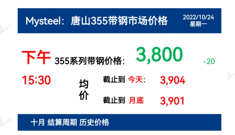 2022年10月24日,下午15:30, 唐山355系列带钢市场价格 3800元/吨,较昨降20元/吨;本月结算周期,截止到今天均价:3904元/吨,截止到月底:3901元/吨。