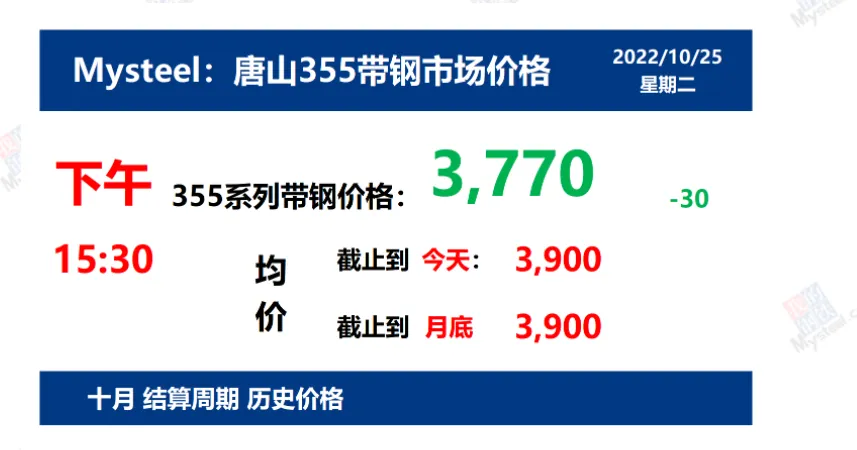 2022年10月25日唐山355带钢市场价格下午15:30,唐山355系列带钢市场价格 3770元/吨,较昨降30元/吨;本月结算周期,截止到今天均价:3900元/吨,截止到月底:3900元/吨。