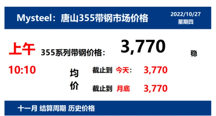 2022年10月27日,上午10:10,唐山355系列带钢市场价格 3770元/吨,较昨稳;本月结算周期,截止到今天均价:3770元/吨,截止到月底:3770元/吨。