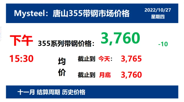 2022年10月27日唐山355带钢市场价格下午15:30,唐山355系列带钢市场价格 3760元/吨,较昨降10元/吨;本月结算周期,截止到今天均价:3765元/吨,截止到月底:3760元/吨。