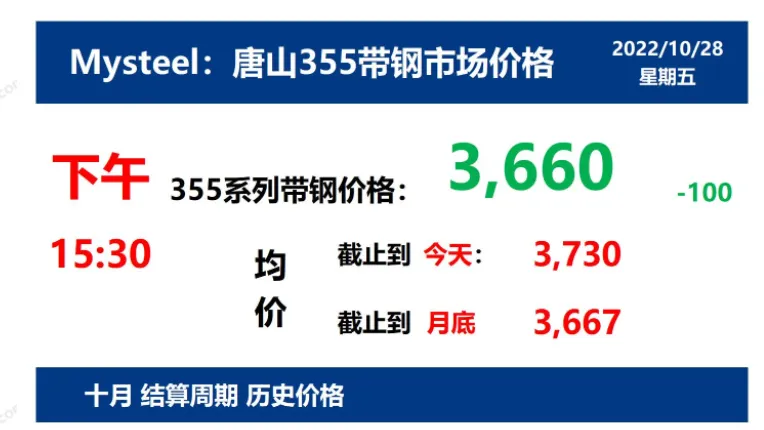 2022年10月28日,下午15:30, 唐山355系列带钢市场价格 3660元/吨,较昨降100元/吨;本月结算周期,截止到今天均价:3730元/吨,截止到月底:3667元/吨。
