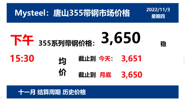 2022年11月3日唐山355带钢市场价格下午15:30,唐山355系列带钢市场价格 3650元/吨,较昨稳元/吨;本月结算周期,截止到今天均价:3651元/吨,截止到月底:3650元/吨。