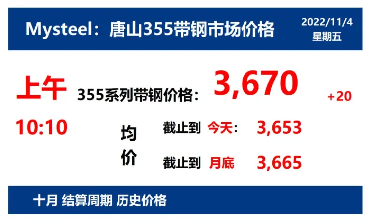 2022年11月4日,上午10:10, 唐山355系列带钢市场价格 3670元/吨,较昨涨20元/吨;本月结算周期,截止到今天均价:3653元/吨,截止到月底:3665元/吨。