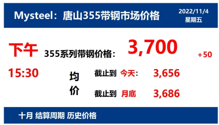 2022年11月4日,下午15:30, 唐山355系列带钢市场价格 3700元/吨,较昨涨50元/吨;本月结算周期,截止到今天均价:3656元/吨,截止到月底:3686元/吨。