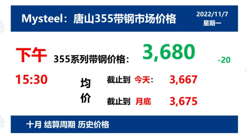2022年11月7日,下午15:30, 唐山355系列带钢市场价格 3680元/吨,较昨降20元/吨;本月结算周期,截止到今天均价:3667元/吨,截止到月底:3675元/吨。