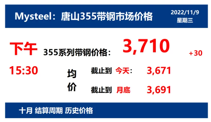 2022年11月9日,下午15:30, 唐山355系列带钢市场价格 3710元/吨,较昨涨30元/吨;本月结算周期,截止到今天均价:3671元/吨,截止到月底:3691元/吨。