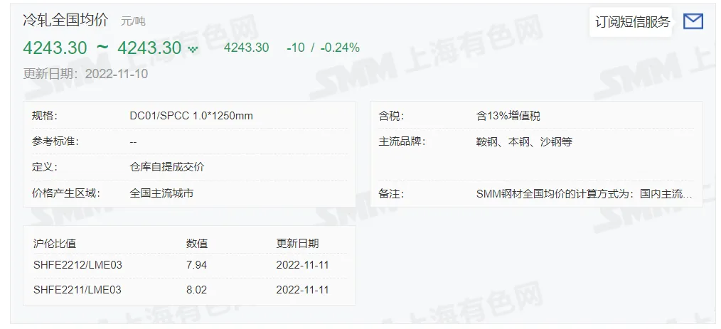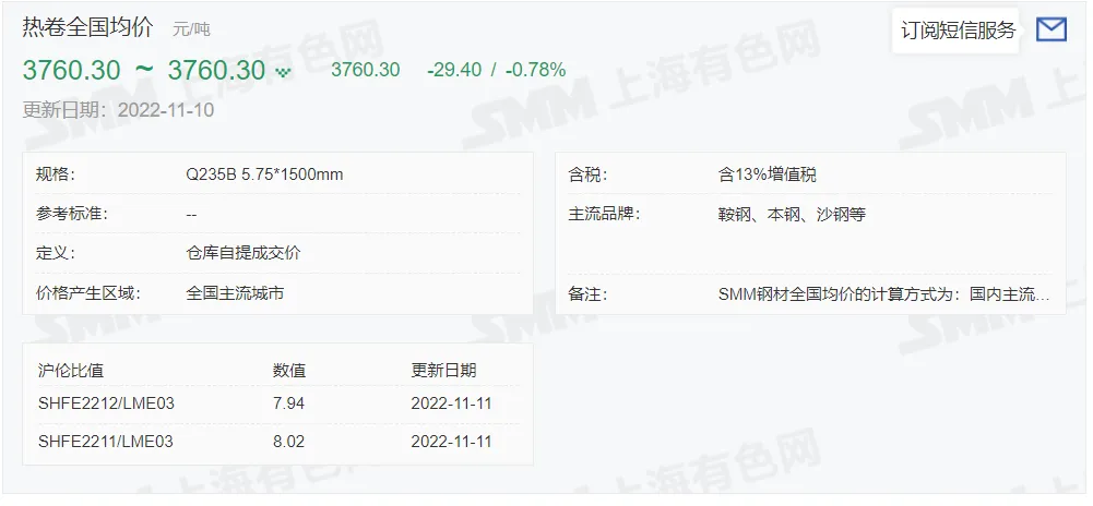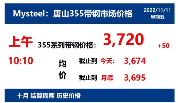 2022年11月11日,上午10:10, 唐山355系列带钢市场价格 3720元/吨,较昨涨50元/吨;本月结算周期,截止到今天均价:3674元/吨,截止到月底:3695元/吨。