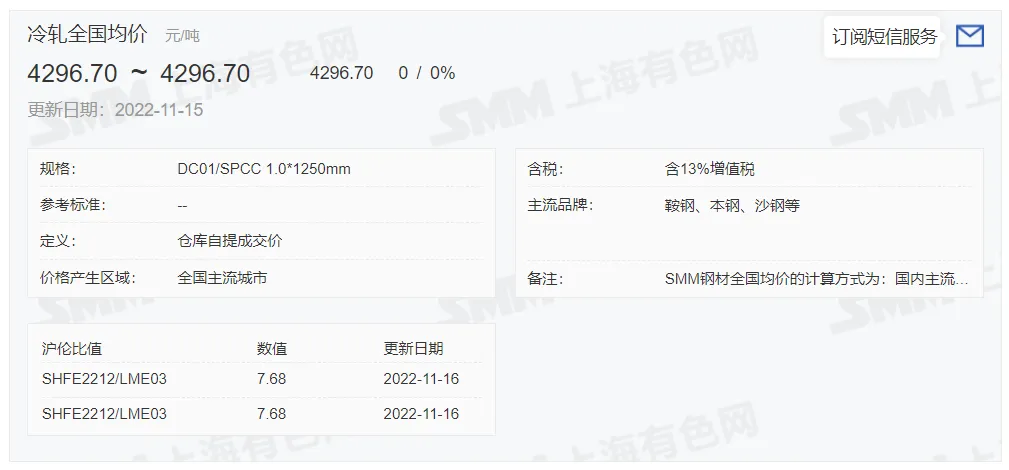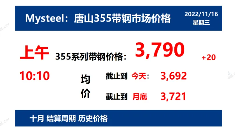 2022年11月16日,上午10:10, 唐山355系列带钢市场价格 3790元/吨,较昨涨20元/吨;本月结算周期,截止到今天均价:3692元/吨,截止到月底:3721元/吨。