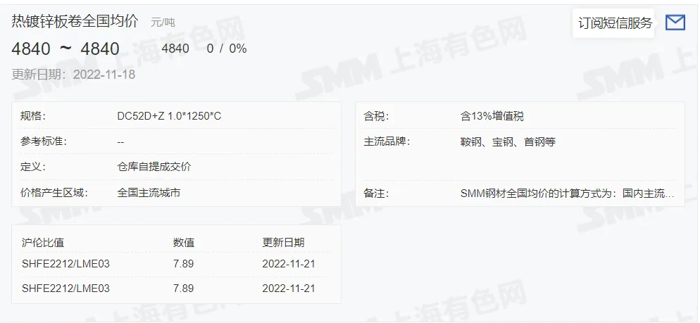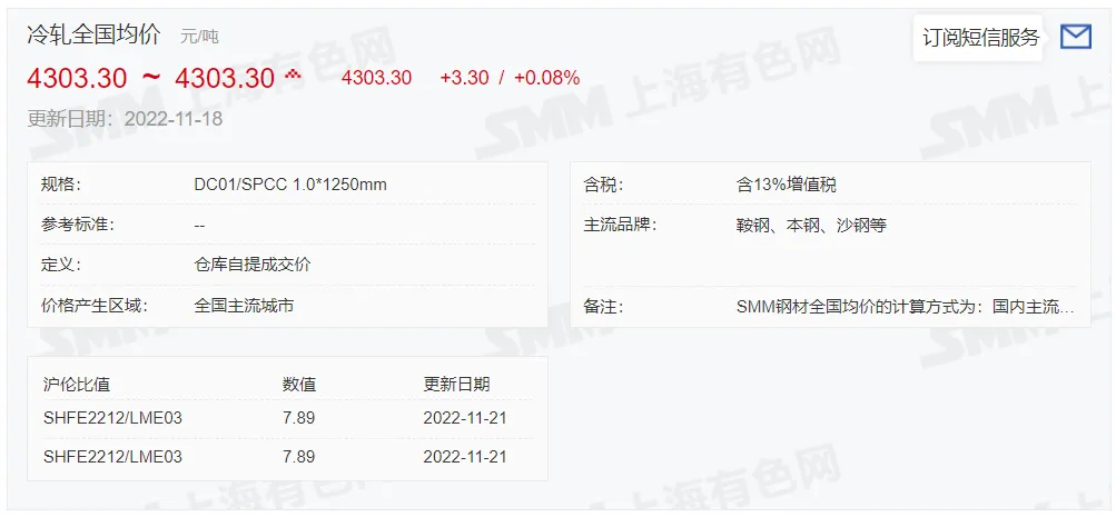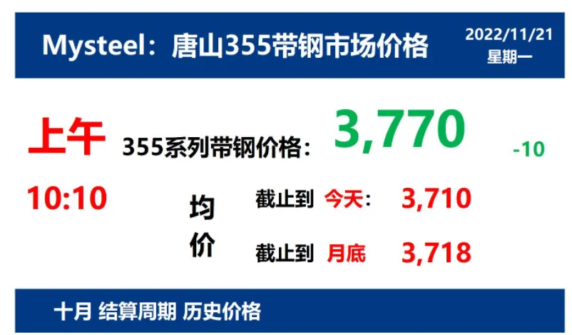2022年11月21日,上午10:10, 唐山355系列带钢市场价格 3770元/吨,较昨降10元/吨;本月结算周期,截止到今天均价:3710元/吨,截止到月底:3718元/吨。