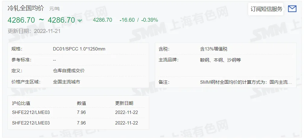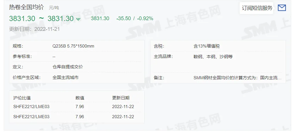 2022年11月22日,上午10:10, 唐山355系列带钢市场价格 3780元/吨,较昨涨10元/吨;本月结算周期,截止到今天均价:3713元/吨,截止到月底:3719元/吨。