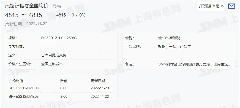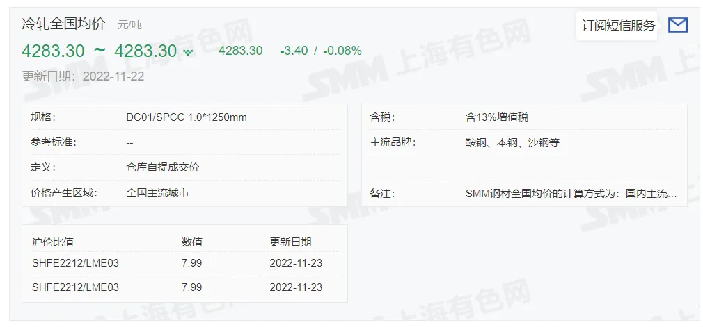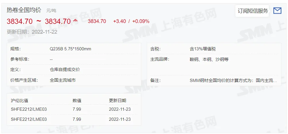 2022年11月23日,上午10:10, 唐山355系列带钢市场价格 3780元/吨,较昨稳;本月结算周期,截止到今天均价:3715元/吨,截止到月底:3719元/吨。