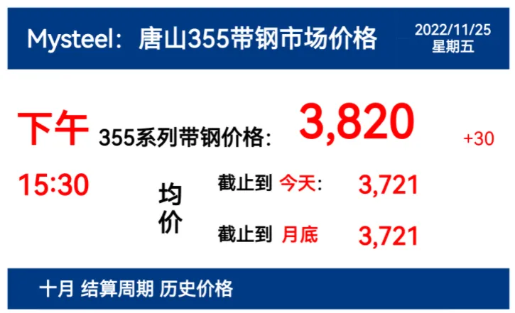 2022年11月25日,下午15:30, 唐山355系列带钢市场价格 3820元/吨,较昨涨30元/吨;本月结算周期,截止到今天均价:3721元/吨,截止到月底:3721元/吨。