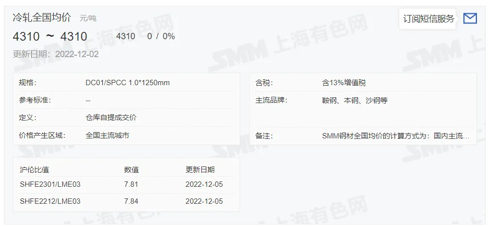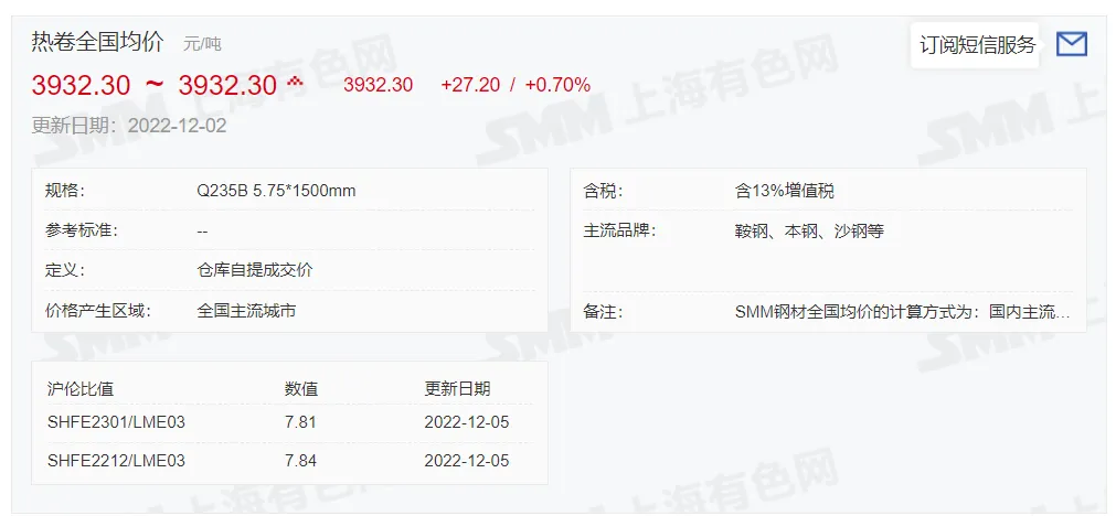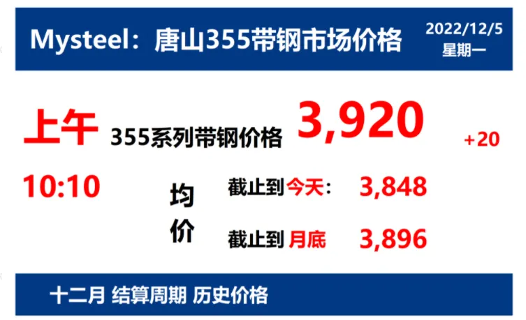 2022年12月5日,上午10:10, 唐山355系列带钢市场价格 3920元/吨,较昨涨20元/吨;本月结算周期,截止到今天均价:3847元/吨,截止到月底:3896元/吨。