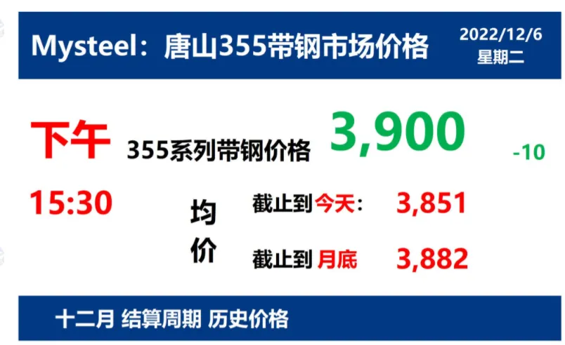 2022年12月6日,下午15:30, 唐山355系列带钢市场价格 3900元/吨,较昨降10元/吨;本月结算周期,截止到今天均价:3851元/吨,截止到月底:3882元/吨。