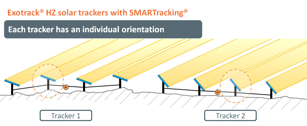 The energy output of a solar plant equipped with single-axis trackers can be further optimized by implementing an efficient tracking process. Basic yield calculations consider a perfectly flat terrain. However no field is completely flat. Slopes and terrain irregularities generate production losses that should be correctly anticipated. Solar tracking expert Exosun took into account those variations in the terrain and developed SMARTracking, an intelligent patented two-step tracking process to address the impact of non flat fields and generate up to 5% additional yield annually, compared to other basic solutions. Let’s take a look at how it works.