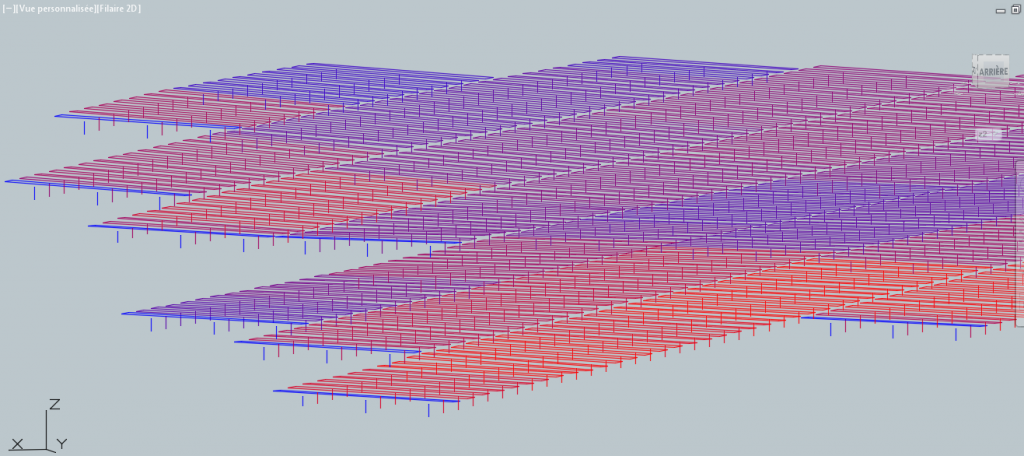 The 3D optimization starts with a detailed topographic analysis of the terrain. It allows to determine the perfect height of each tracker pile in order to smooth the surface of the solar modules on the plant as much as possible and to reduce the need for grading. Consequently, mutual shading between tables is reduced, thereby reducing backtracking periods and optimizing the energy yield. In addition, it also avoids on-site piles cutting.