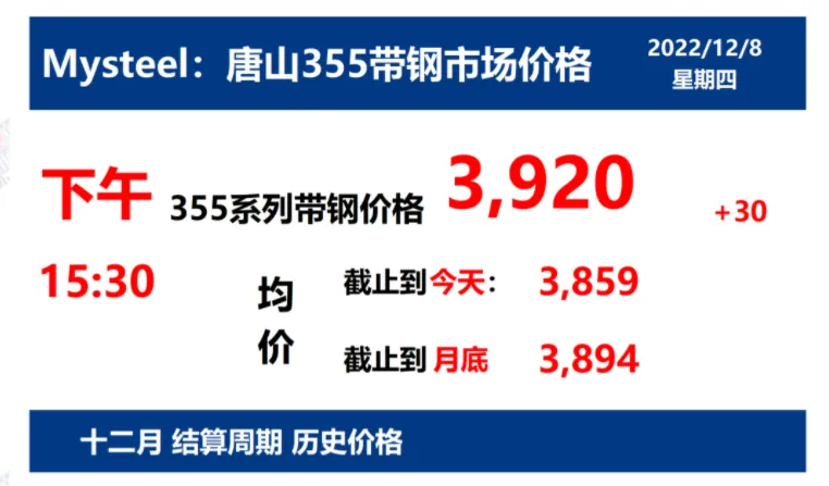 2022年12月8日唐山355带钢市场价格下午15:30,唐山355系列带钢市场价格 3920元/吨,较昨涨30元/吨;本月结算周期,截止到今天均价:3859元/吨,截止到月底:3894元/吨。