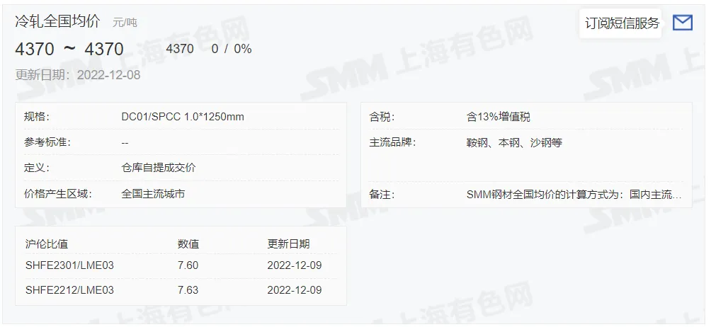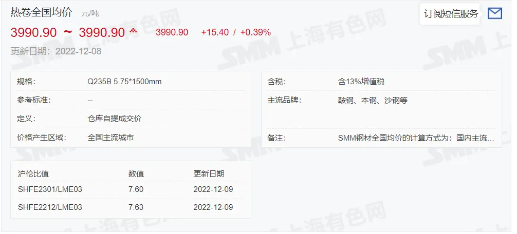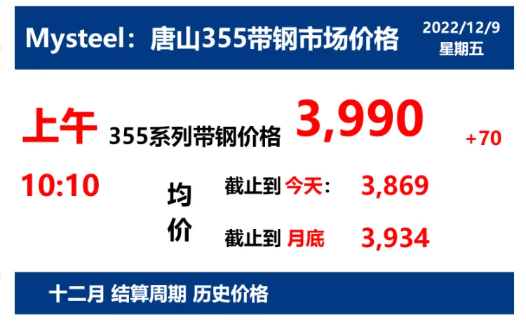 2022年12月9日,上午10:10, 唐山355系列带钢市场价格 3990元/吨,较昨涨70元/吨;本月结算周期,截止到今天均价:3869元/吨,截止到月底:3934元/吨。