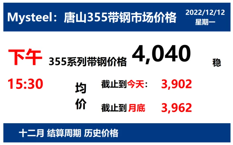2022年12月12日,下午15:30, 唐山355系列带钢市场价格 4040元/吨,较昨稳;本月结算周期,截止到今天均价:3902元/吨,截止到月底:3962元/吨。
