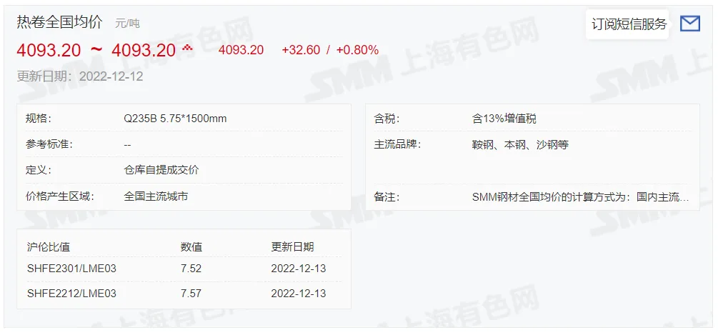 2022年12月13日,上午10:10, 唐山355系列带钢市场价格 4020元/吨,较昨降20元/吨;本月结算周期,截止到今天均价:3908元/吨,截止到月底:3953元/吨。