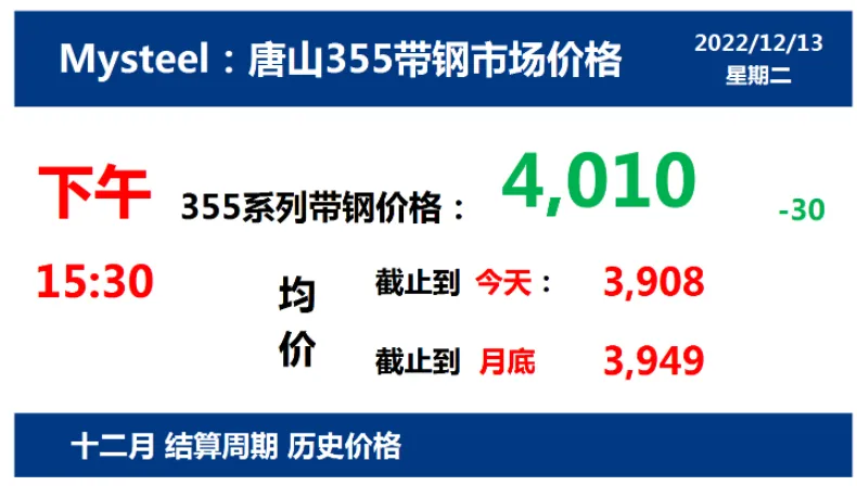 2022年12月13日,下午15:30, 唐山355系列带钢市场价格 4010元/吨,较昨降30元/吨;本月结算周期,截止到今天均价:3908元/吨,截止到月底:3949元/吨。
