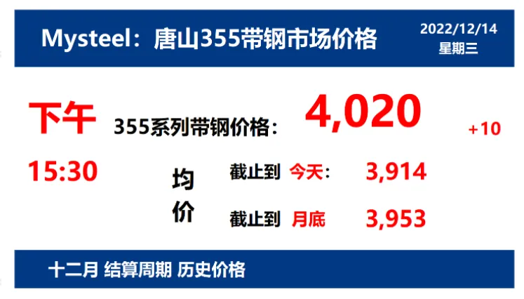 2022年12月14日,下午15:30, 唐山355系列带钢市场价格 4020元/吨,较昨涨10元/吨;本月结算周期,截止到今天均价:3914元/吨,截止到月底:3953元/吨。