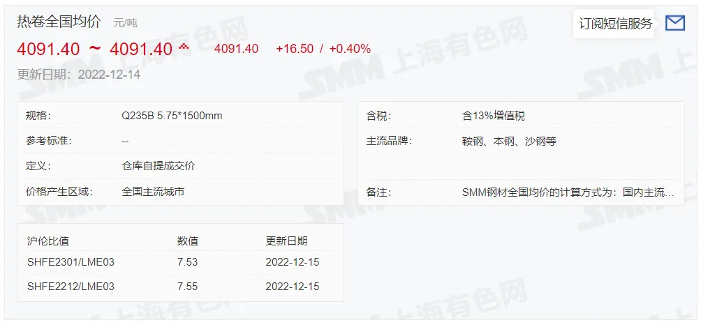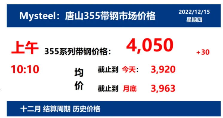 2022年12月15日,上午10:10,唐山355系列带钢市场价格 4050元/吨,较昨涨30元/吨;本月结算周期,截止到今天均价:3920元/吨,截止到月底:3963元/吨。