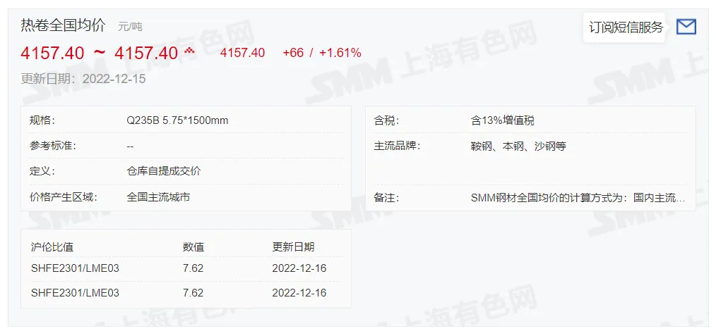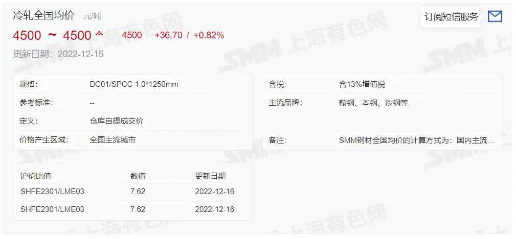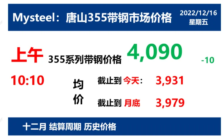 2022年12月16日,上午10:10, 唐山355系列带钢市场价格 4090元/吨,较昨降10元/吨;本月结算周期,截止到今天均价:3931元/吨,截止到月底:3979元/吨。