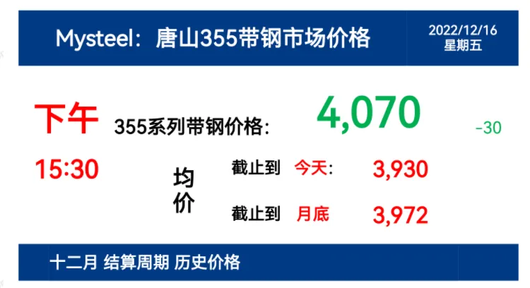 2022年12月16日,下午15:30, 唐山355系列带钢市场价格 4070元/吨,较昨降30元/吨;本月结算周期,截止到今天均价:3930元/吨,截止到月底:3972元/吨。