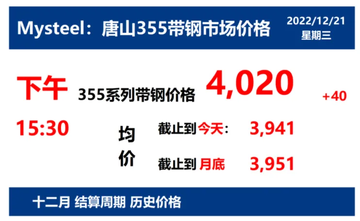 2022年12月21日,下午15:30, 唐山355系列带钢市场价格 4020元/吨,较昨涨40元/吨;本月结算周期,截止到今天均价:3941元/吨,截止到月底:3951元/吨。