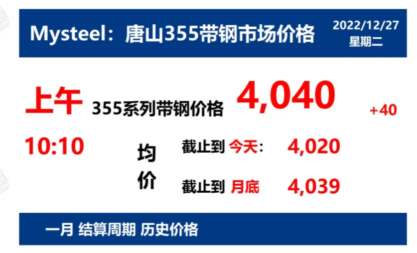 2022年12月27日,上午10:10, 唐山355系列带钢市场价格 4040元/吨,较昨涨40元/吨;本月结算周期,截止到今天均价:4020元/吨,截止到月底:4039元/吨。