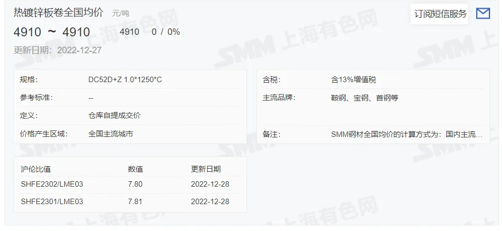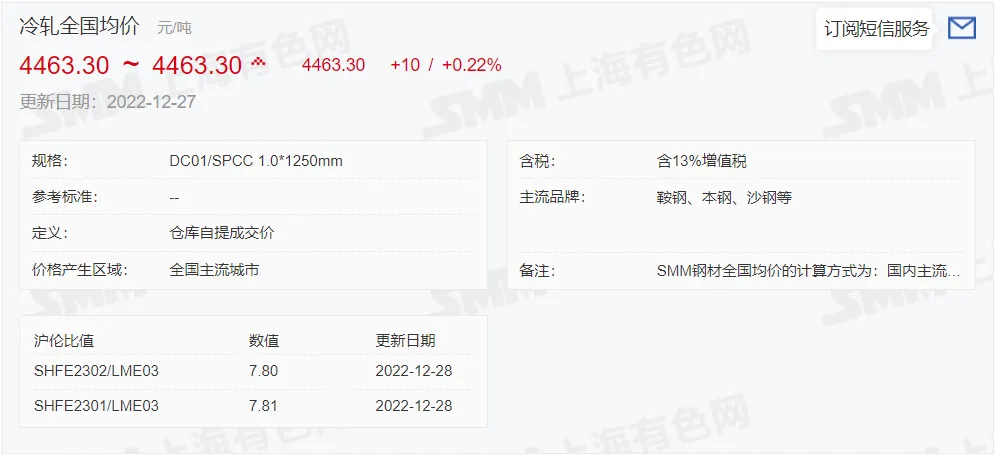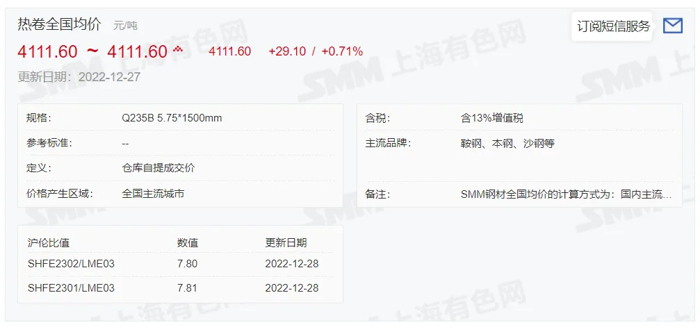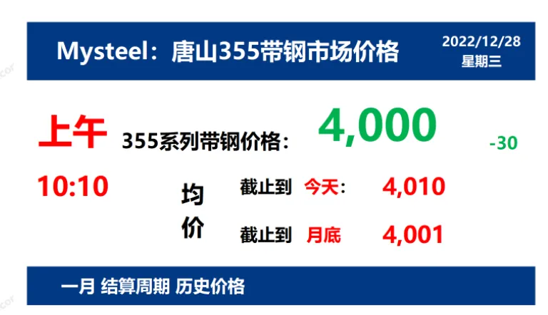 2022年12月28日,上午10:10, 唐山355系列带钢市场价格 4000元/吨,较昨降30元/吨;本月结算周期,截止到今天均价:4010元/吨,截止到月底:4001元/吨。