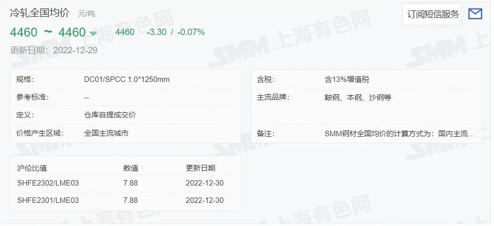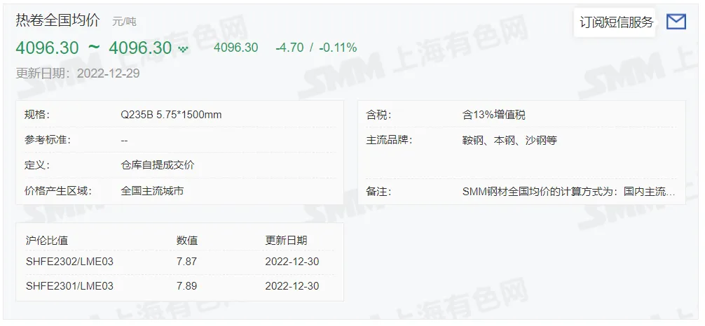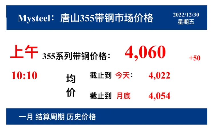 2022年12月30日,上午10:10, 唐山355系列带钢市场价格 4060元/吨,较昨涨50元/吨;本月结算周期,截止到今天均价:4022元/吨,截止到月底:4054元/吨。
