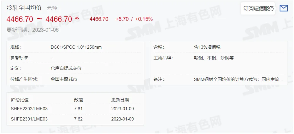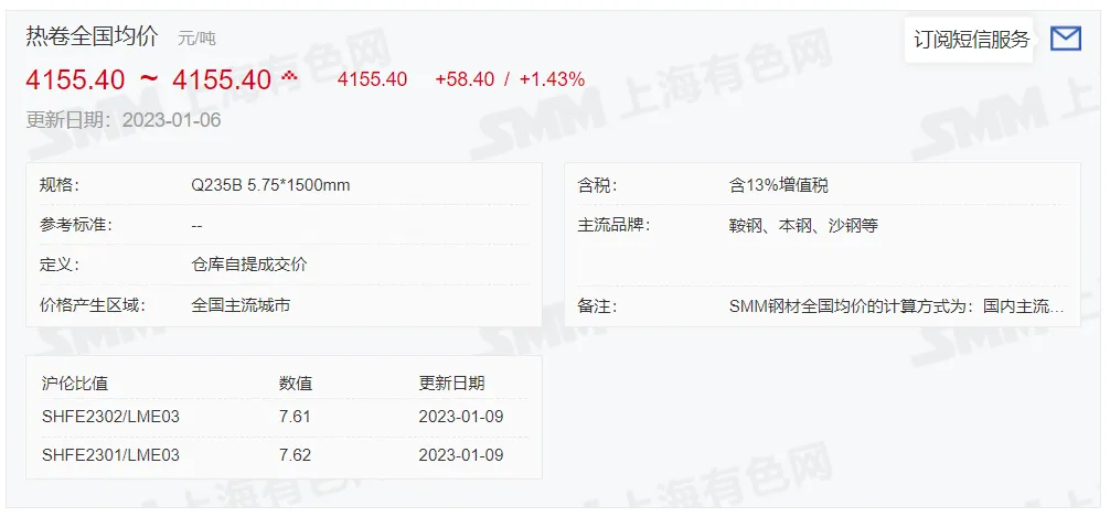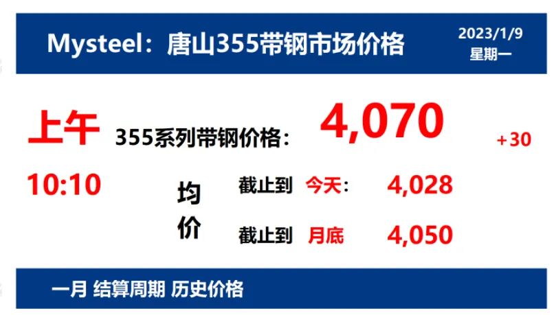 2023年1月9日,上午10:10, 唐山355系列带钢市场价格 4070元/吨,较昨涨30元/吨;本月结算周期,截止到今天均价:4028元/吨,截止到月底:4050元/吨。