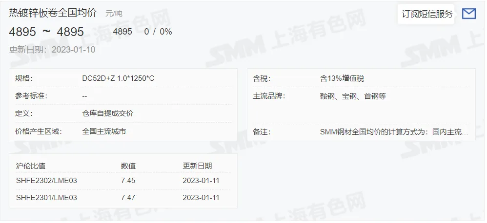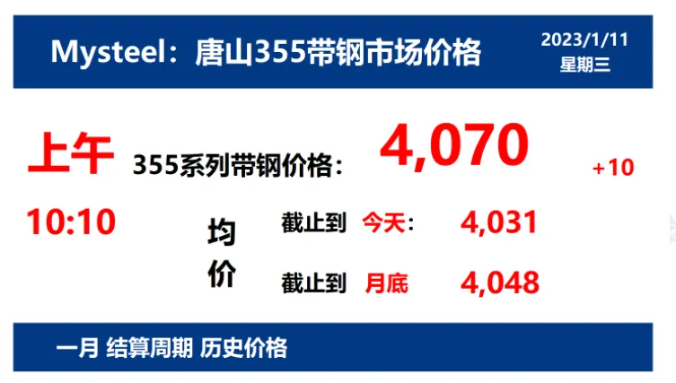 2023年1月11日,上午10:10, 唐山355系列带钢市场价格 4070元/吨,较昨涨10元/吨;本月结算周期,截止到今天均价:4031元/吨,截止到月底:4048元/吨。