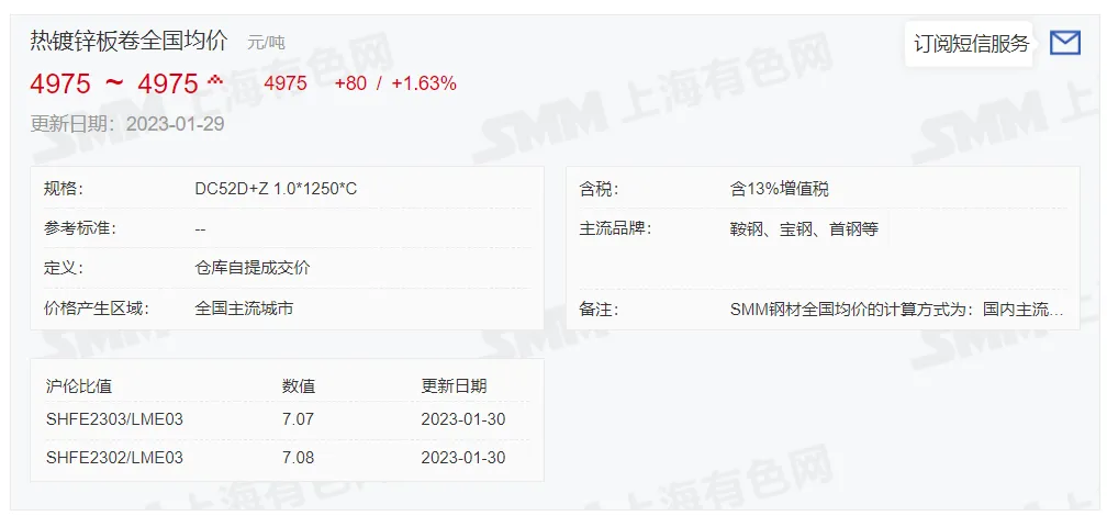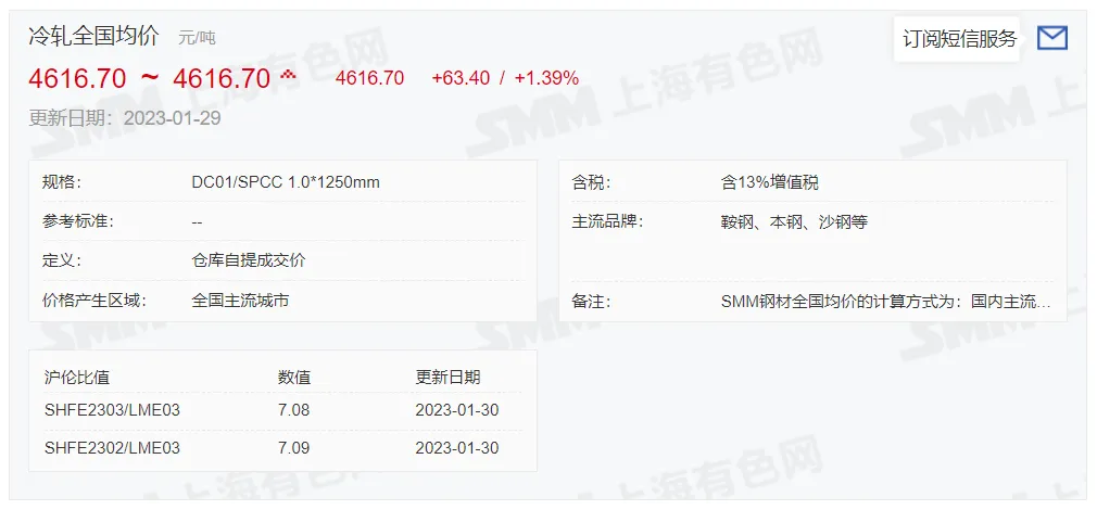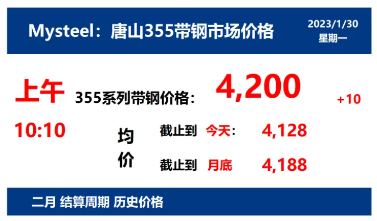 2023年1月30日,上午10:10, 唐山355系列带钢市场价格 4200元/吨,较昨涨10元/吨;本月结算周期,截止到今天均价:4128元/吨,截止到月底:4188元/吨。