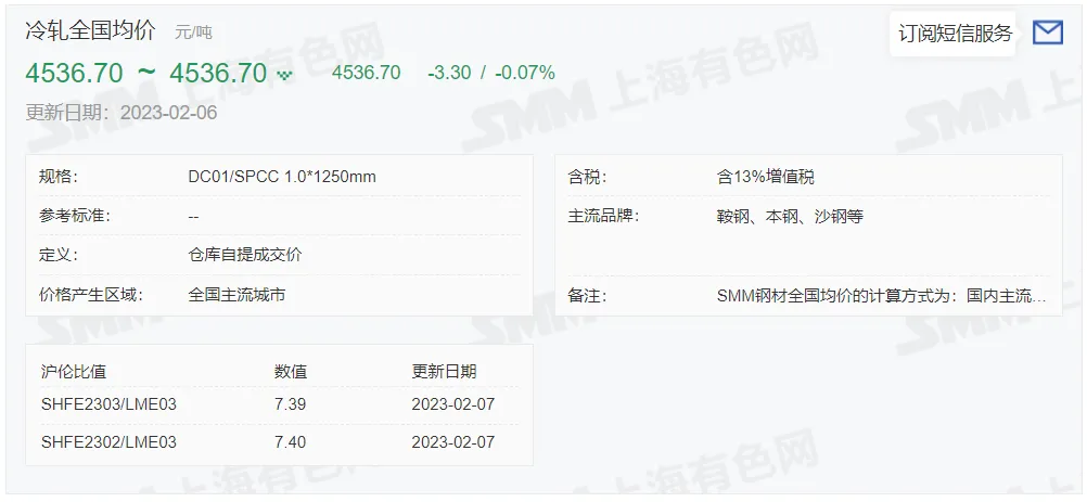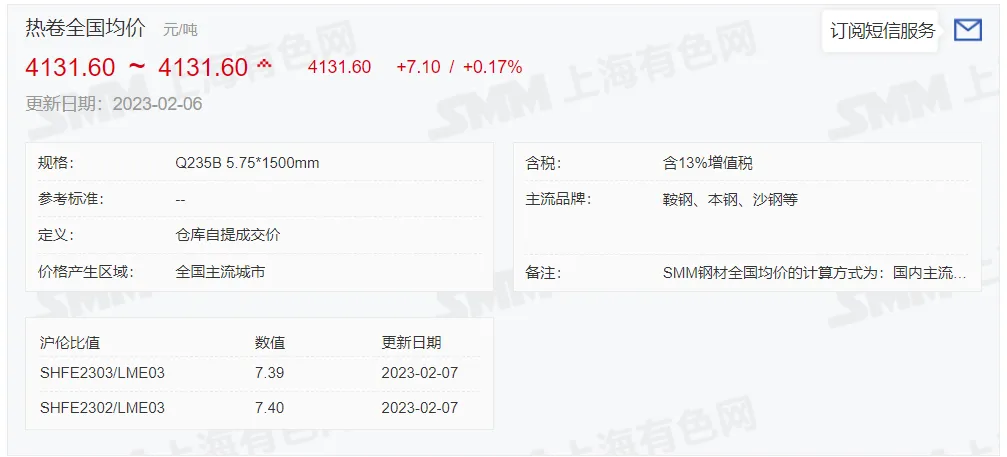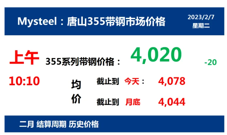 2023年2月7日,上午10:10, 唐山355系列带钢市场价格 4020元/吨,较昨降20元/吨;本月结算周期,截止到今天均价:4078元/吨,截止到月底:4044元/吨。