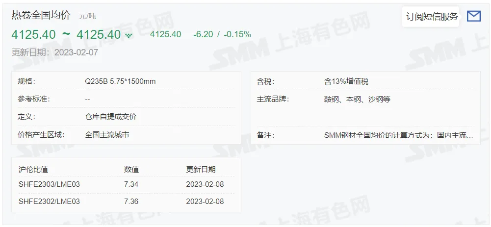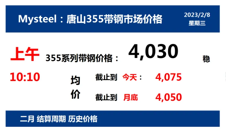 2023年2月8日,上午10:10, 唐山355系列带钢市场价格 4030元/吨,较昨稳;本月结算周期,截止到今天均价:4075元/吨,截止到月底:4050元/吨。