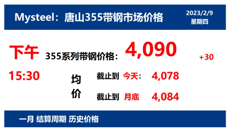 2023年2月9日唐山355带钢市场价格下午15:30,唐山355系列带钢市场价格 4090元/吨,较昨涨30元/吨;本月结算周期,截止到今天均价:4078元/吨,截止到月底:4084元/吨。