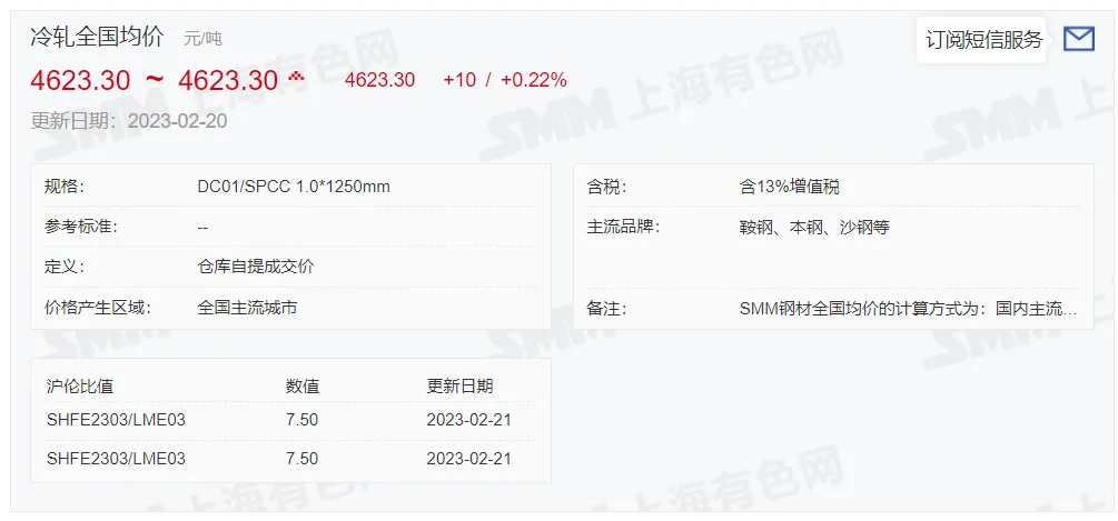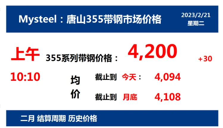 2023年2月21日,上午10:10, 唐山355系列带钢市场价格 4200元/吨,较昨涨30元/吨;本月结算周期,截止到今天均价:4094元/吨,截止到月底:4108元/吨。