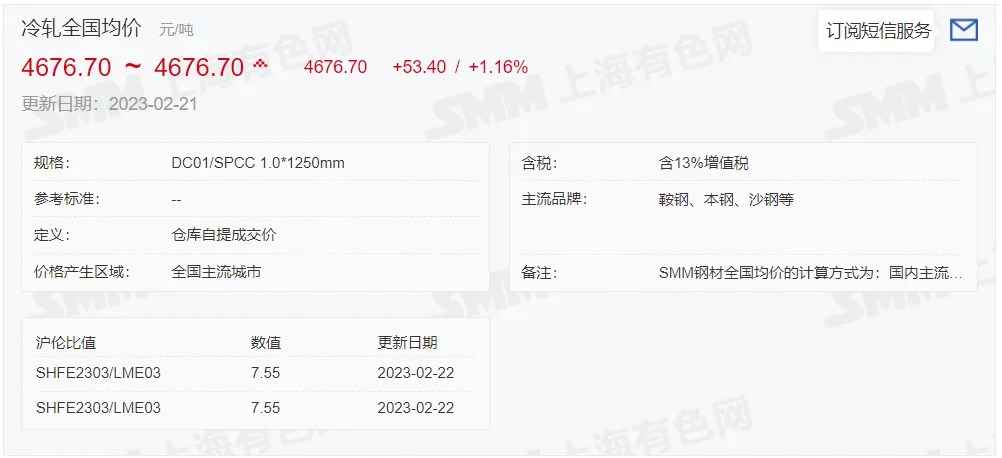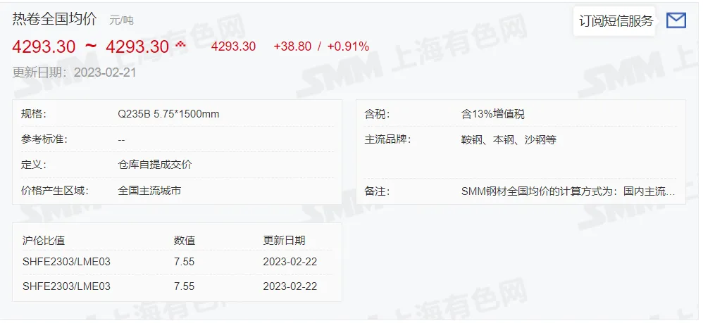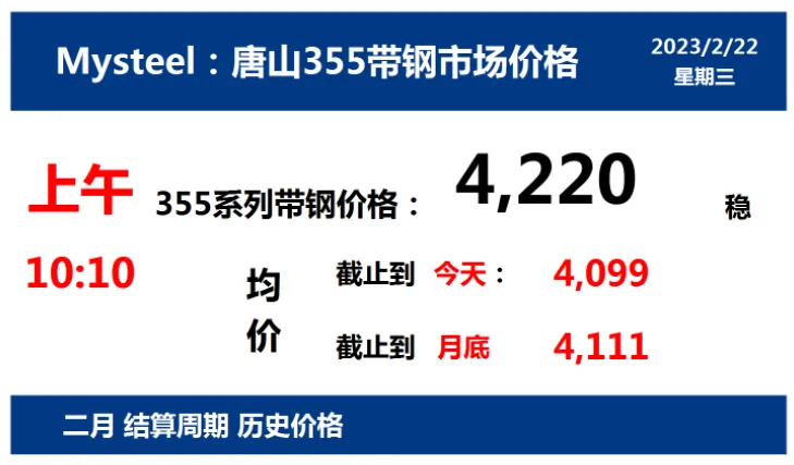 2023年2月22日,上午10:10, 唐山355系列带钢市场价格 4220元/吨,较昨稳;本月结算周期,截止到今天均价:4099元/吨,截止到月底:4111元/吨。