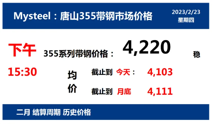 2023年2月23日,下午15:30, 唐山355系列带钢市场价格 4220元/吨,较昨稳;本月结算周期,截止到今天均价:4103元/吨,截止到月底:4111元/吨。