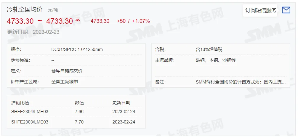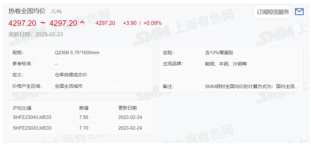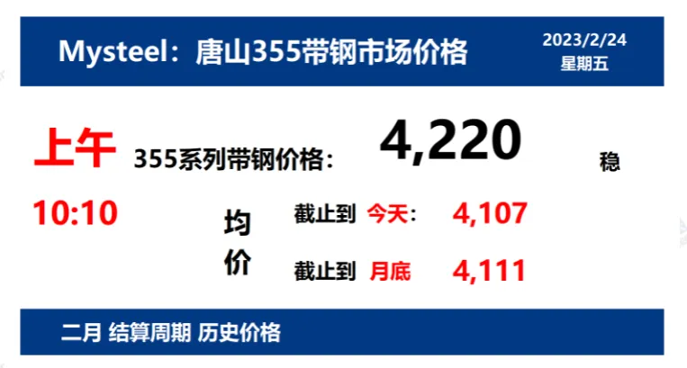 2023年2月24日,上午10:10,唐山355系列带钢市场价格 4220元/吨,较昨稳;本月结算周期,截止到今天均价:4107元/吨,截止到月底:4111元/吨。