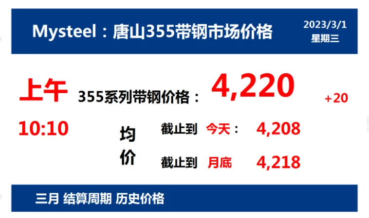 2023年3月1日,上午10:10, 唐山355系列带钢市场价格 4220元/吨,较昨涨20元/吨;本月结算周期,截止到今天均价:4208元/吨,截止到月底:4218元/吨。